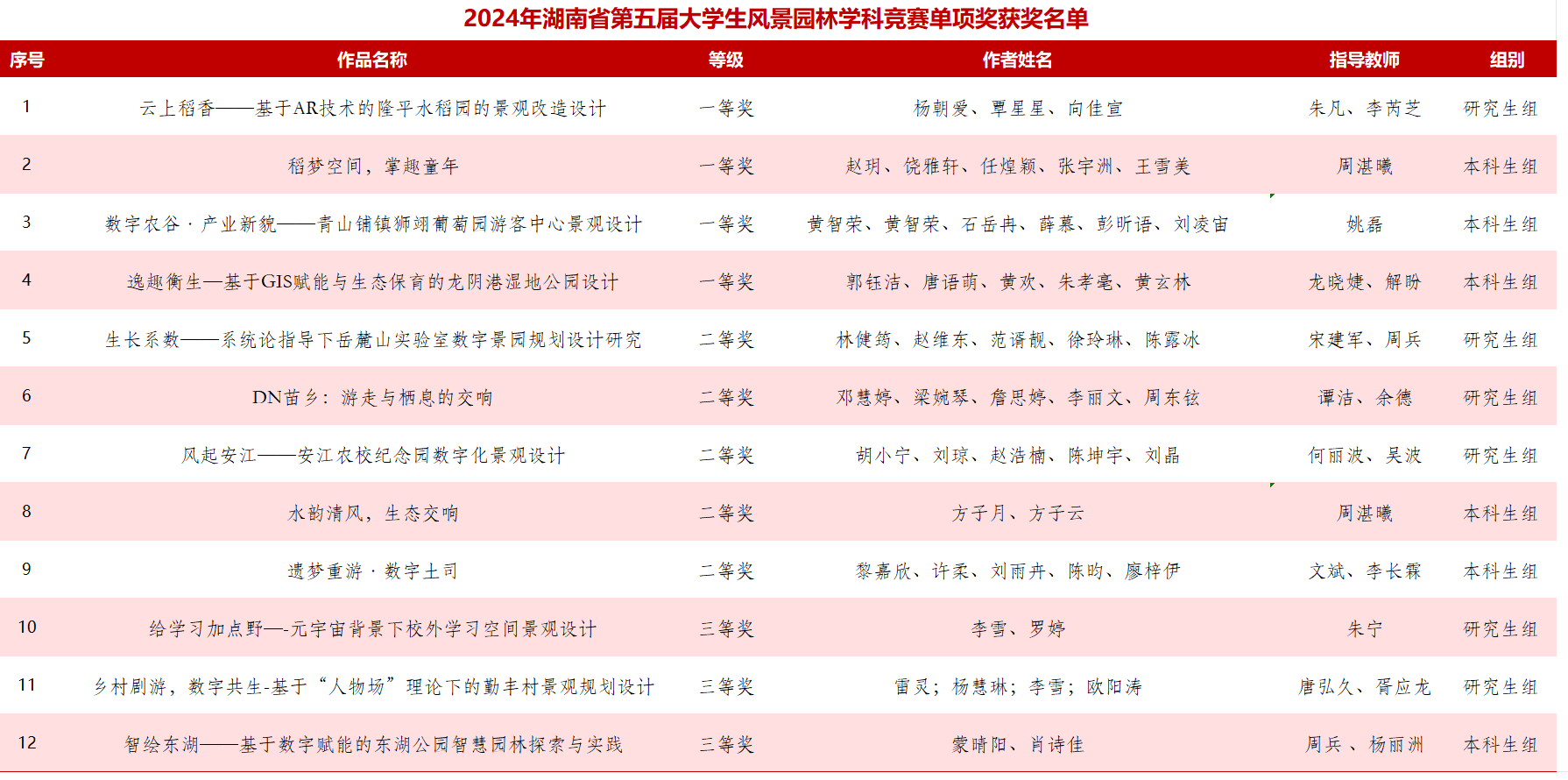 3月21日,由湖南省教育厅主办的第五届湖南省大学生风景园林学科竞赛颁奖典礼在中南林业科技大学圆满落幕,本届竞赛以“数智赋能,智慧景园”为主题,聚焦数字技术,创新设计思维,营造智慧园林。