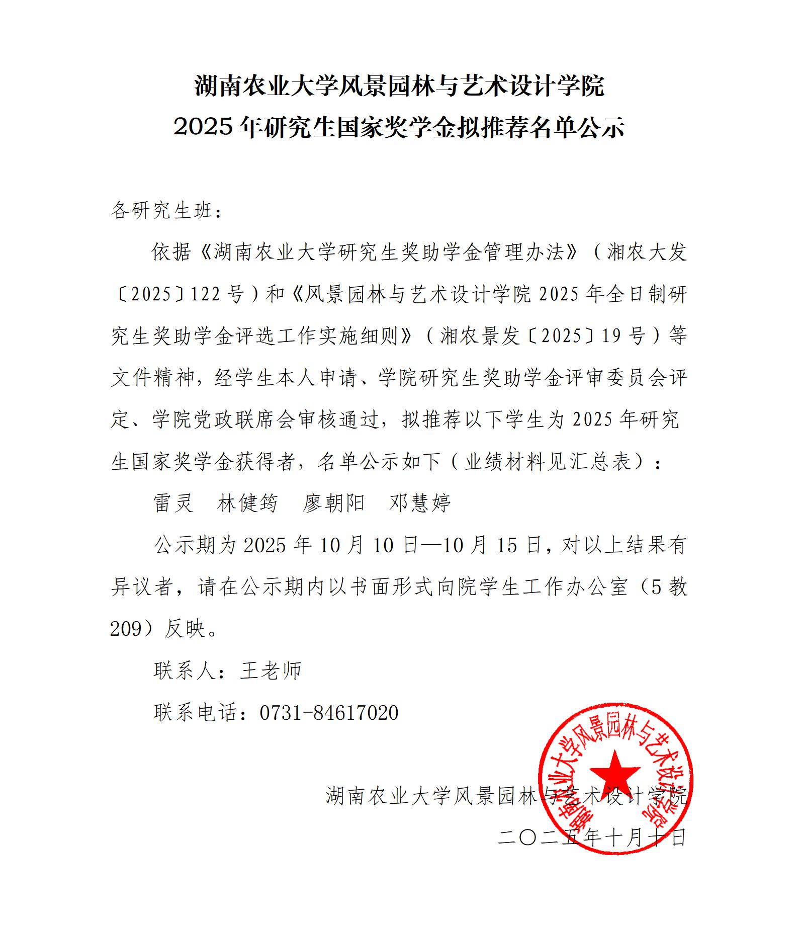 湖南农业大学风景园林与艺术设计学院 2025年研究生国家奖学金拟推荐名单公示