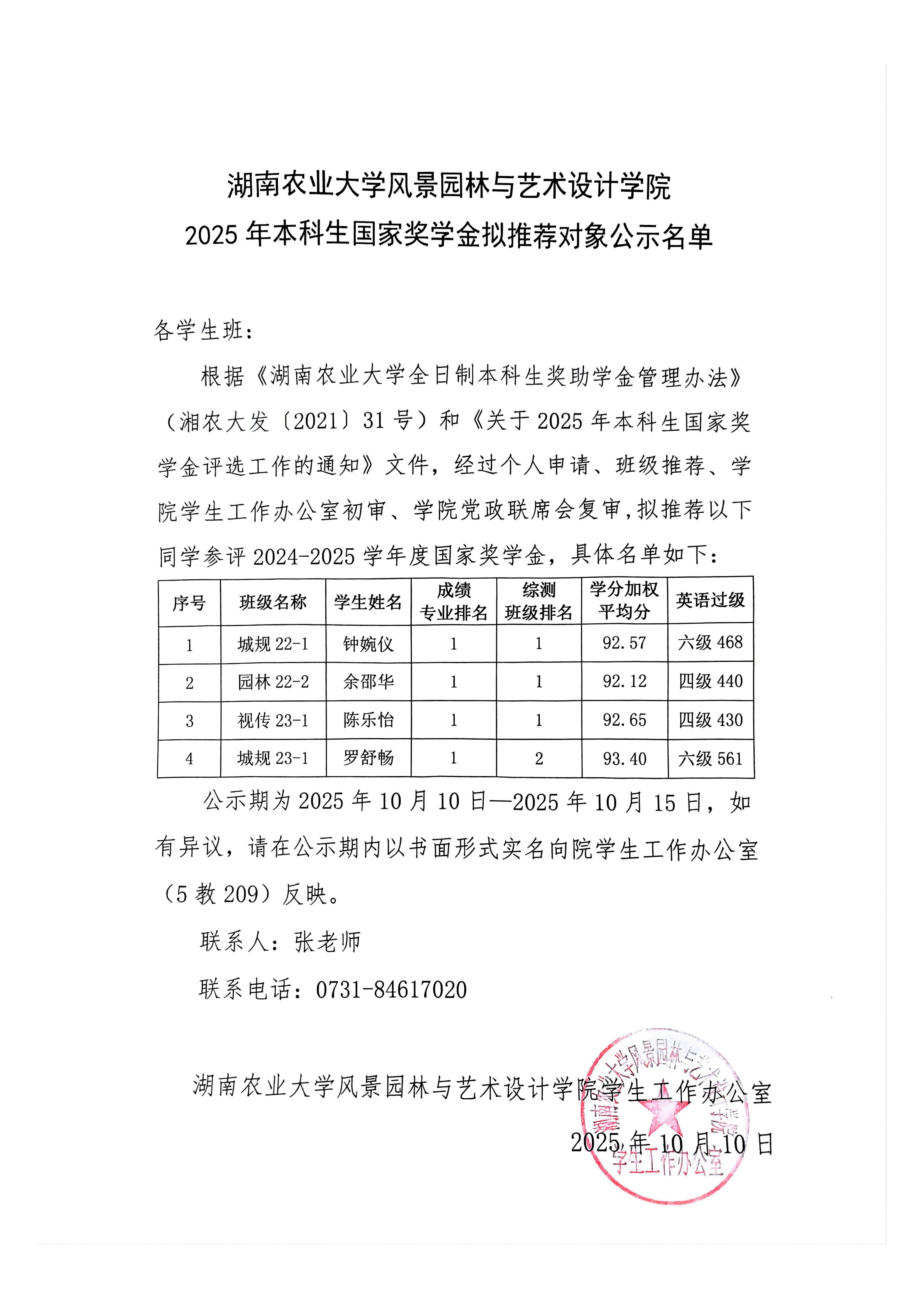 湖南农业大学风景园林与艺术设计学院 2025年本科生国家奖学金拟推荐对象公示名单