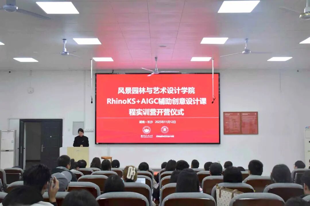 为推动设计教育数字化转型,培养兼具技术革新能力与设计创造力的复合型人才,11月12日上午9时,湖南农业大学风景园林与艺术设计学院“RhinoKS+AIGC辅助创意设计课程实训营”开营仪式在第四教学楼T2教室隆重举行。学院院长黄炼、企业合作方总经理李壮、实训营导师团队及全体学员共同出席仪式,仪式由学院产品设计系主任蔺薛菲教授主持。