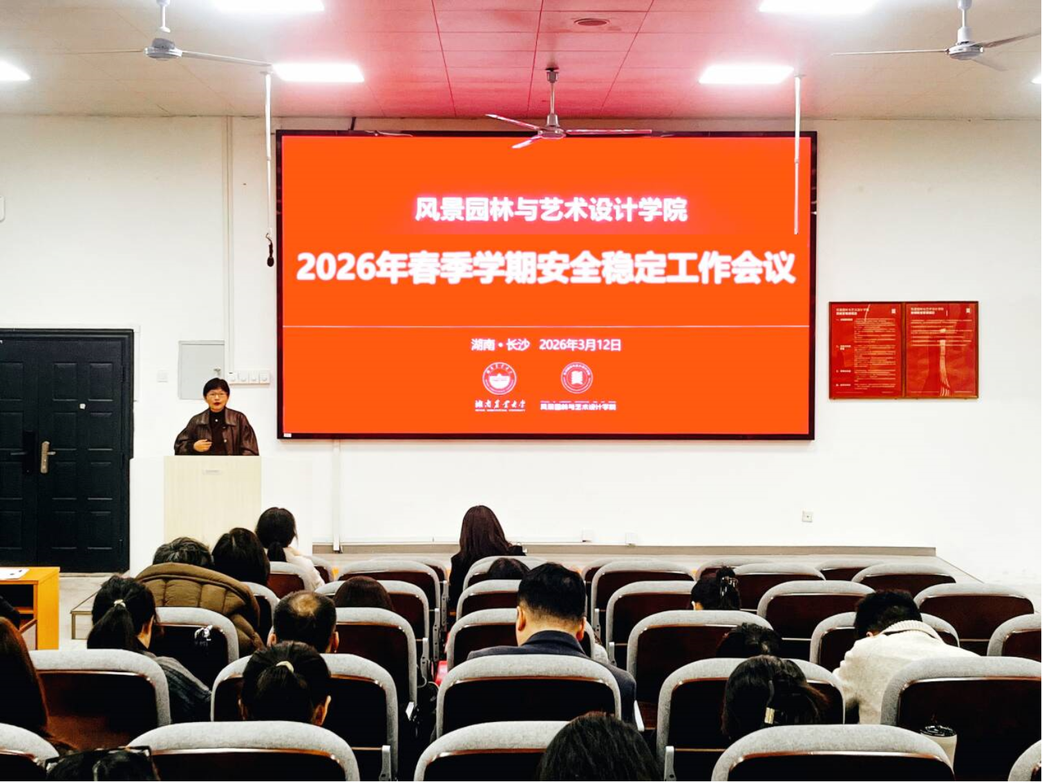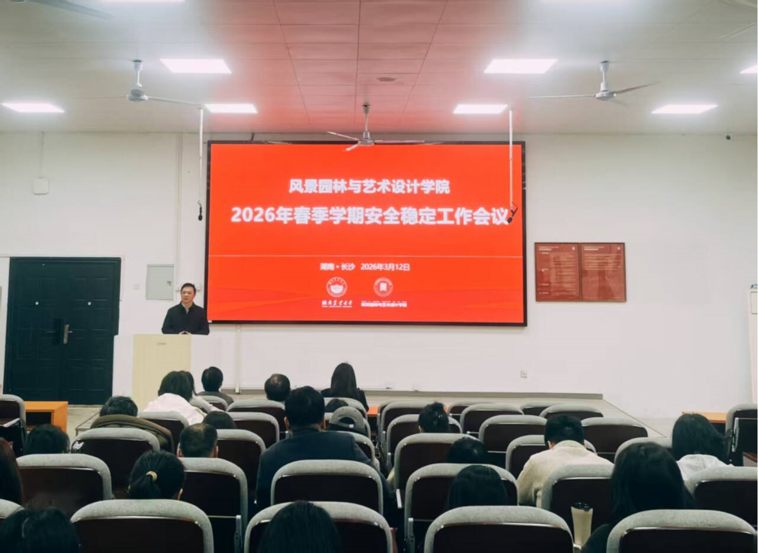为进一步夯实校园安全基础,确保2026年春季学期各项工作平稳有序开展,切实维护学院师生的生命财产安全和校园和谐稳定,3月12日,风景园林与艺术设计学院在四教T2召开了新学期安全稳定工作会议,学院院长黄炼、党委书记李方一、专职组织员洪彬、党委副书记兼副院长周笑妮、副院长何丽波以及全体教职工参加会议。