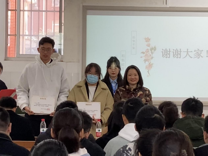 邓益成副书记为二等奖获奖者易董柏慧、扶珍妮、徐璐铖同学颁奖