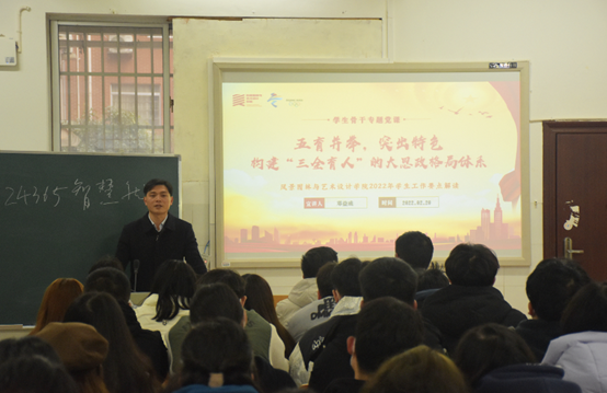 为全面加强党建引领,提升思政育人实效,展现艺术文化特色,培养优质学生品质,2022年2月20日下午,学院在11教北124组织以“五育并举,突出特色,构建‘三全育人’的大思政格局体系”为主题的学生骨干专题党课。本次党课由学院党委副书记邓益成主讲,学工办主任张冰清、学院团委书记邓深林、辅导员刘盈、王伟出席本次党课。学院学生党支部党员、入党积极分子、团学干部、各班主要学生干部参加本次党课。