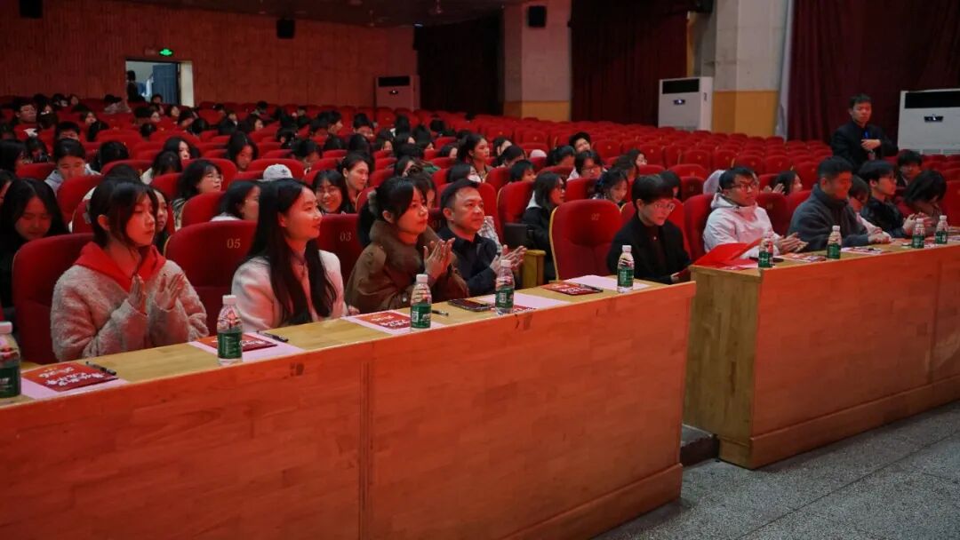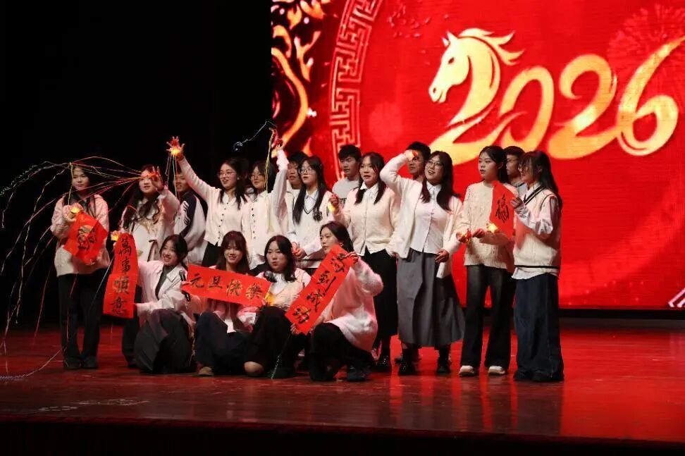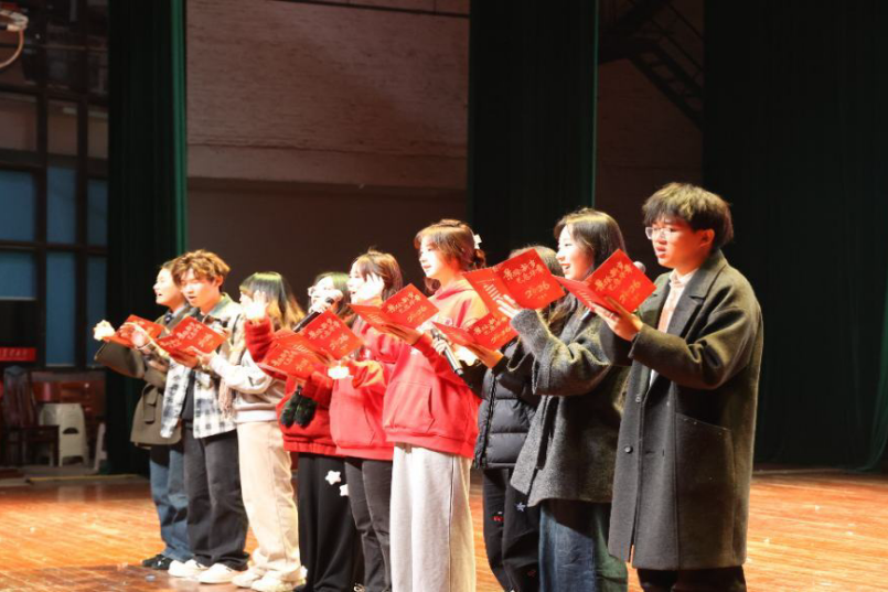 紧随其后,主持队带来朗诵《迎元日,赴新程》,朗读者们身着整齐服装,以铿锵有力又饱含深情的语调,将对新年的憧憬、对学院发展的祝福融入字句之间,让在场师生深切感受到青春的担当与奋进的力量。