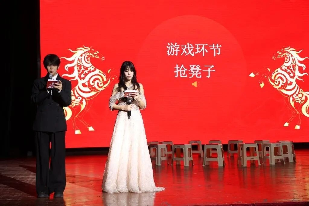 本次元旦晚会特设两大全员参与游戏,经典的抢凳子比拼速度与反应,音乐骤停时的席位争夺引爆全场欢笑;趣味十足的看视频猜网络热门梗考验“冲浪”实力,魔性片段轮番播放,无论老师还是同学,都能在轻松欢乐的氛围里尽情嗨玩。