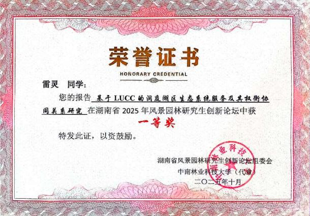 在科研领域,他展现出强烈的探索精神与扎实的研究能力。他积极参与导师课题组,围绕区域生态安全与景观规划等前沿方向深入探索。他以第一作者在《环境科学》(CSCD中文核心)发表学术论文,探讨洞庭湖区生态系统服务的时空演变规律;以第二作者在《地域研究与开发》(CSSCI中文核心)发表论文,分析旅游地文化感知的影响机理。此外,他的研究成果还获得了湖南省土地学会、自然资源资产学会优秀论文一等奖,并在湖南省研究生创新论坛、中国研究生美丽中国创新设计大赛、湖南省风景园林学科竞赛等多项高层次学术与专业竞赛中屡获佳绩,累计获得省级以上奖项十余项,彰显了其创新的思维与解决复杂问题的潜力。