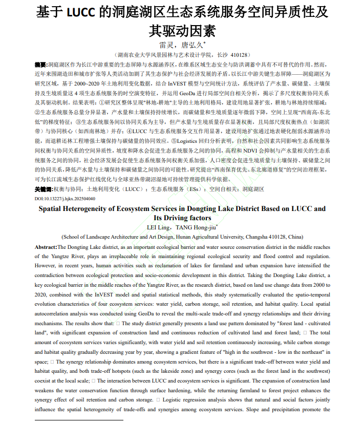 1.以第一作者在《环境科学》(CSCD中文核心)(IF:7.561)发表《基于LUCC的洞庭湖区生态系统服务时空变化特征及其驱动因素》