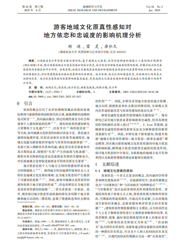 2.以第二作者在《地域研究与开发》(CSSCI中文核心)(IF:4.546)发表《游客地域文化原真性感知对地方依恋和忠诚度的影响机理分析》