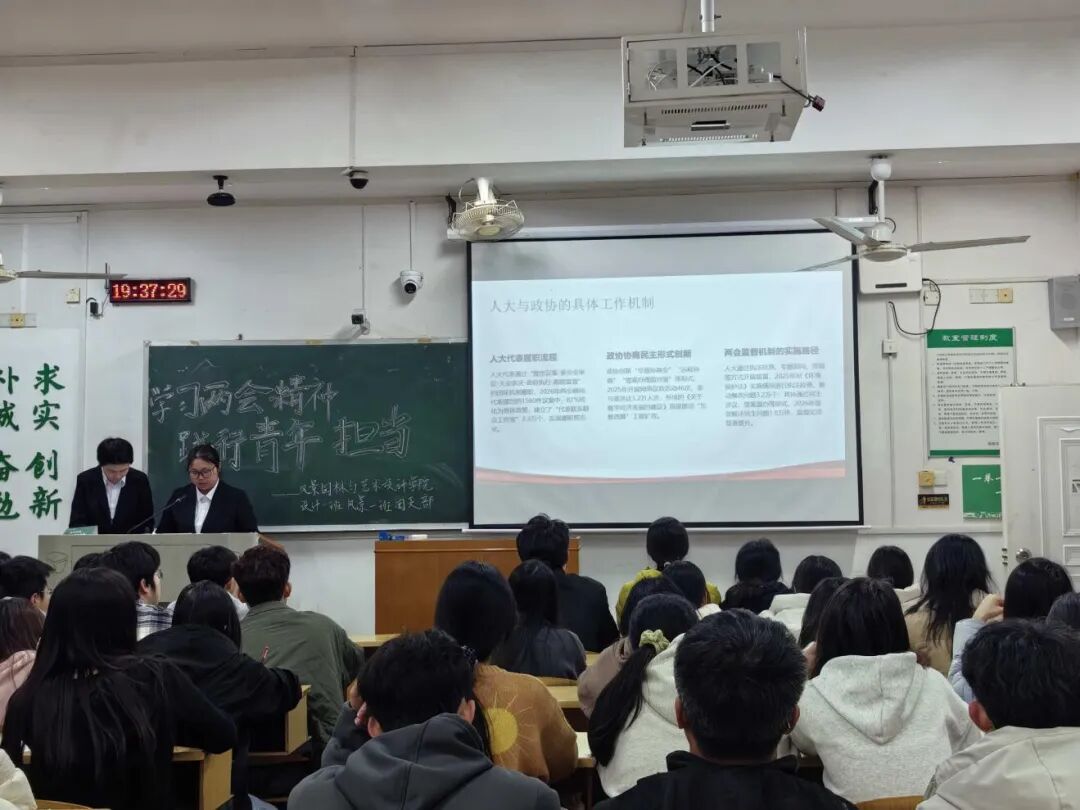 2026年全国两会胜利闭幕后,“十五五”高质量发展蓝图成为青年学子关注的焦点。为引导同学们准确把握国家发展脉络、将个人成长融入民族复兴大局,风景园林与艺术设计学院团委组织部于2026年4月2日在第七教学楼组织25级开展了“学习两会精神,践行青年担当”青年大学生政治理论学习活动。
