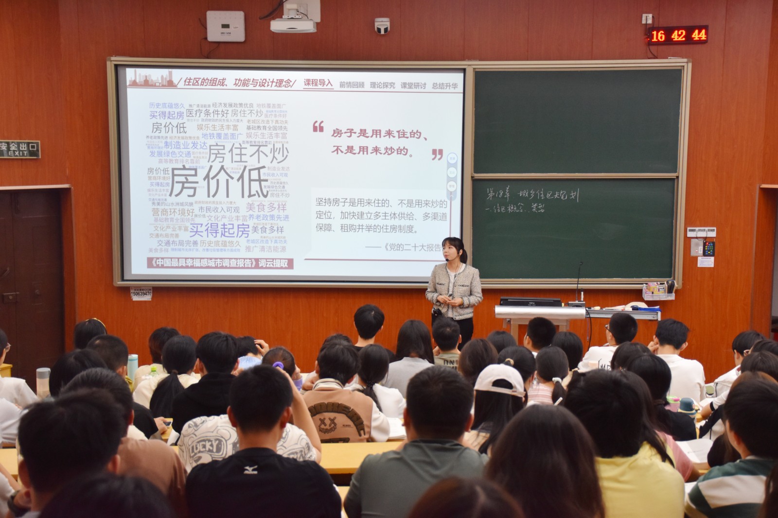 范佳老师主讲课程《城乡规划原理》是人文地理与城乡规划专业的核心专业课,湖南省线上、线下混合式一流本科课程,此次公开课的授课内容为“城乡住区规划”。范老师首先通过“长沙连续15年获批最具幸福感城市”的视频切入课堂、引出本节课的教学内容;随后,以学生线上学习情况为学情基础,围绕“城市与乡村住区的区别、住区规划结构的演变、以人为本设计理念的设计实践”三大内容开展线下课堂研讨;同时,在教学过程中注重思政元素的融入,引导学生思考城乡规划与设计应该如何应对人口老龄化的国情,增强了学生的专业使命感及社会责任感。