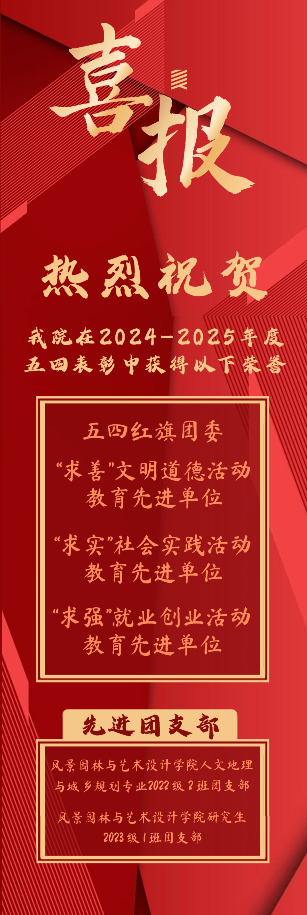 在本次表彰大会中,风景园林与艺术设计学院荣获五四红旗团委、“求善”文明道德活动教育先进单位、“求实”社会实践活动教育先进单位、“求强”就业创业活动教育先进单位等多项荣誉,风景园林与艺术设计学院人文地理与城乡规划专业2022级2班团支部、风景园林与艺术设计学院研究生2023级1班团支部获评先进团支部。