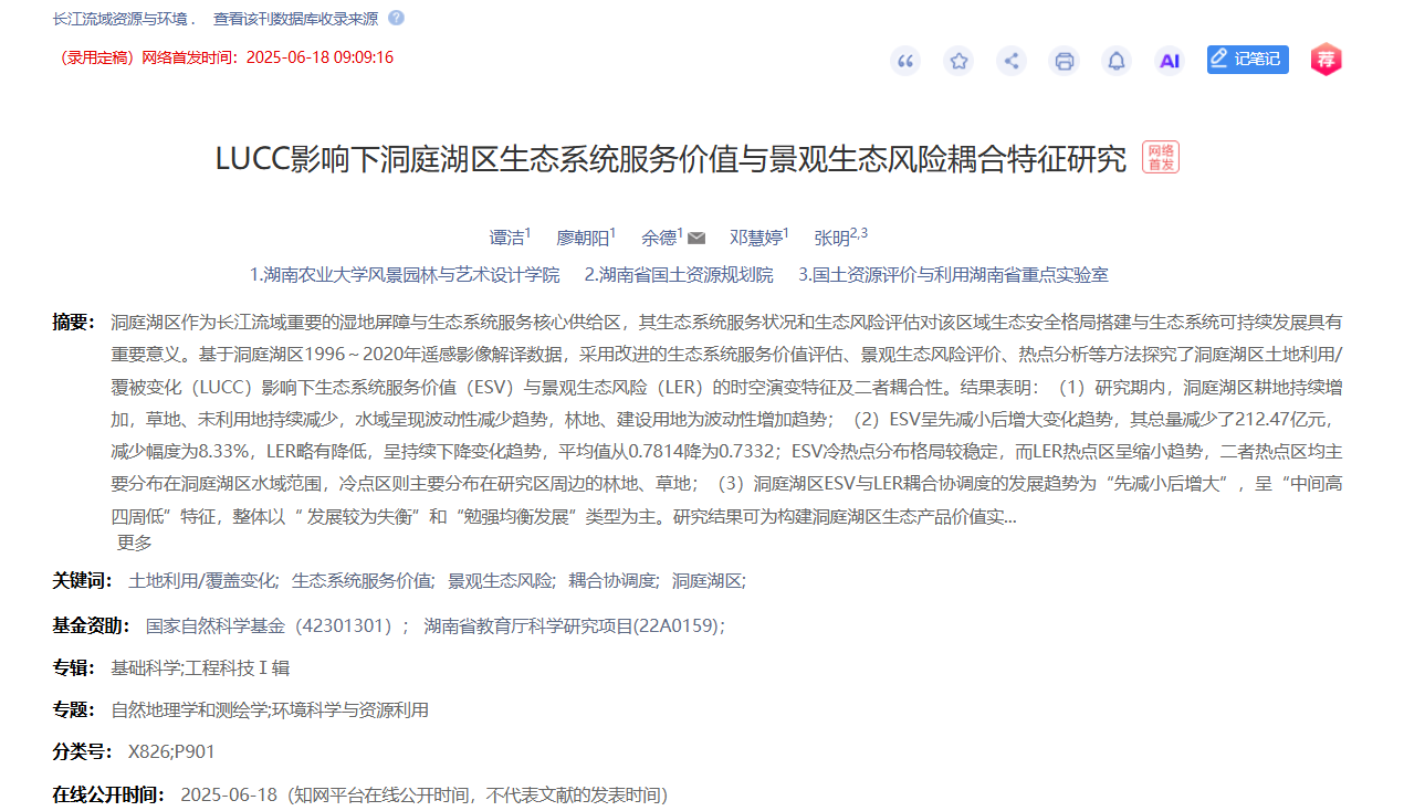 近期,2023级风景园林专业硕士研究生廖朝阳同学在导师谭洁副教授与人文地理与城乡规划专业教师余德博士的共同指导下,在CSSCI、CSCD与北大中文核心期刊《长江流域资源与环境》上发表了题为《LUCC影响下洞庭湖区生态系统服务价值与景观生态风险耦合特征研究》的学术论文。该研究聚焦洞庭湖区这一长江流域重要湿地屏障与生态服务核心区域,基于1996–2020年遥感影像数据,综合运用改进的生态系统服务价值评估模型、景观生态风险评价及热点分析等方法,系统揭示了土地利用/覆被变化(LUCC)对区域生态系统服务价值(ESV)与景观生态风险(LER)时空演变的影响及其耦合关系。