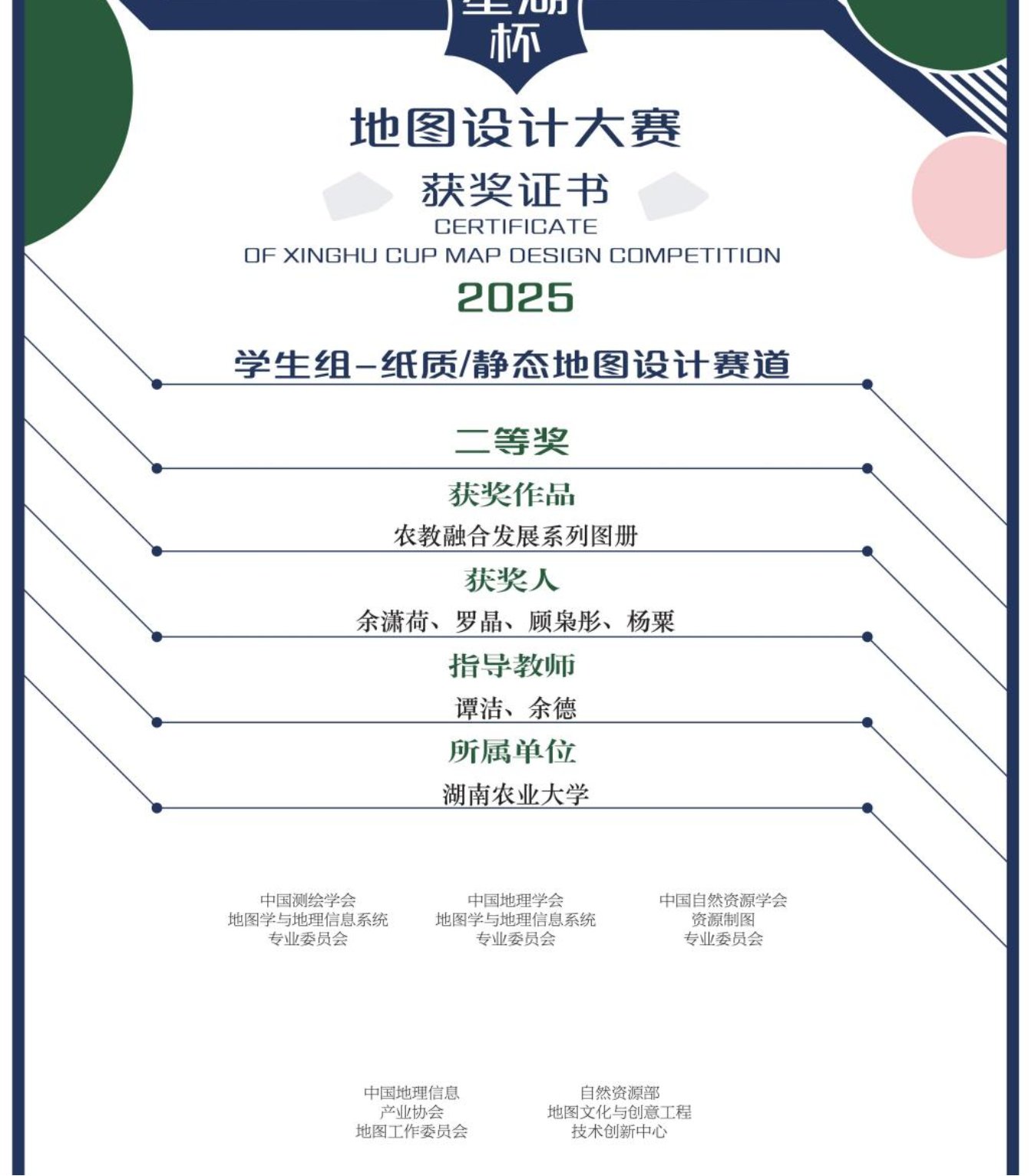 近日,第二届“星湖杯”地图设计大赛获奖名单正式公布。由风景园林与艺术设计学院人文地理与城乡规划系谭洁、余德两位老师指导,2024级人文地理与城乡规划专业余潇荷、罗晶、杨粟以及设计专业顾枭彤四位同学共同完成的作品,凭借出色的创意与专业表现,荣获学生组“纸质/静态地图设计”赛道二等奖。