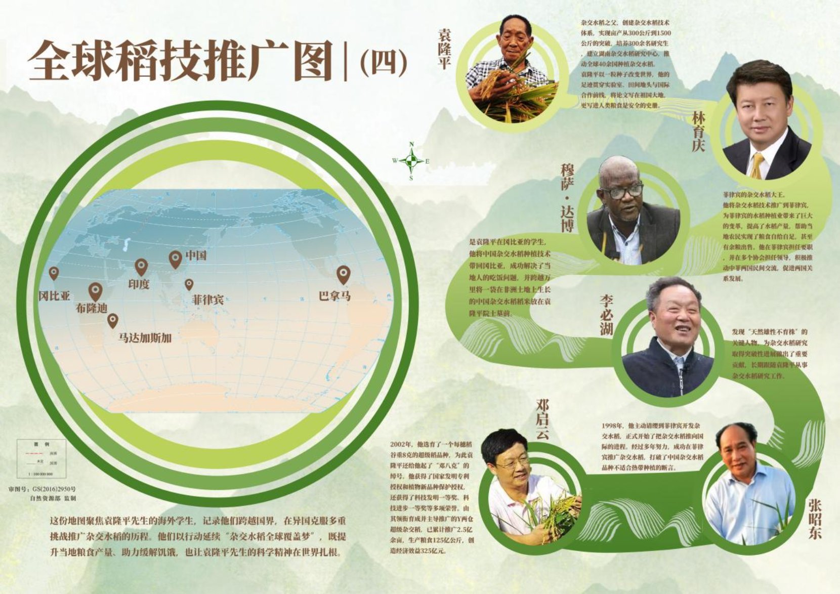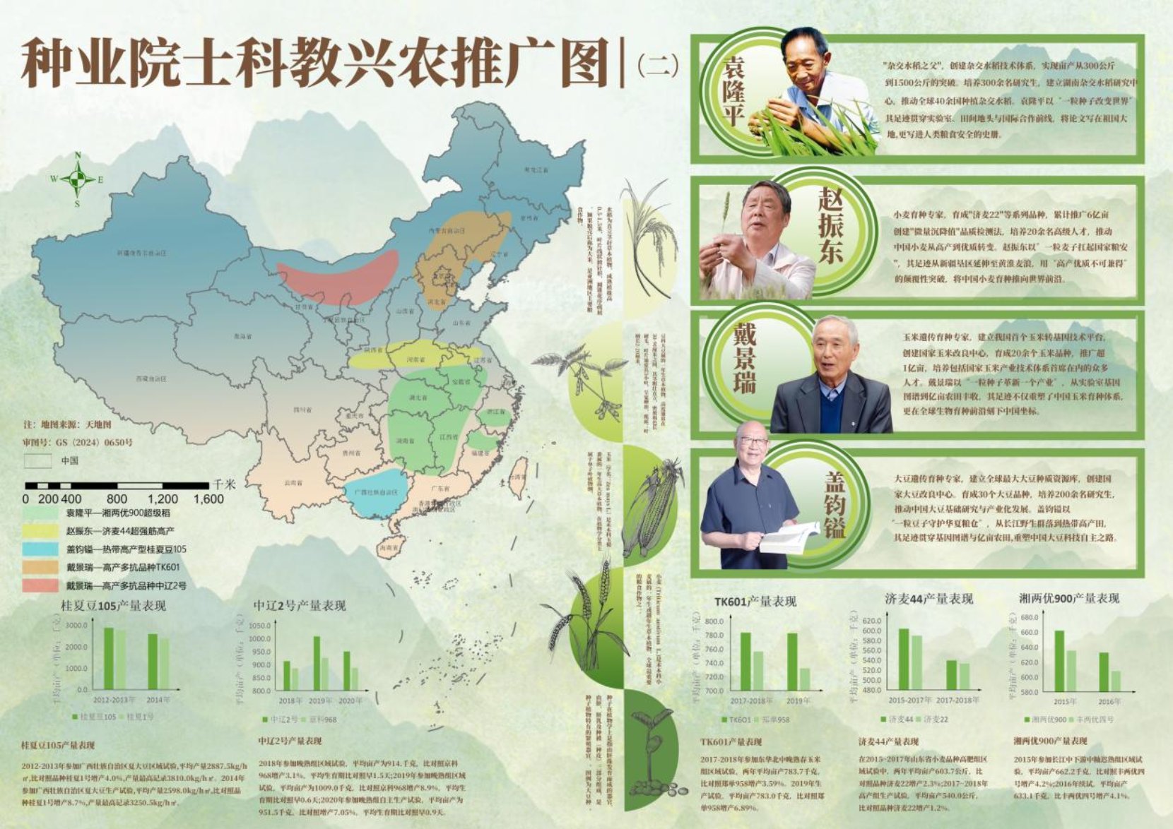 首幅《中国农林类大学分布图》以古籍名句点题,通过环绕式布局展现高校分布,并突出五所顶尖院校特色。第二幅《种业院士科教兴农推广图》聚焦四位院士及其种业成果,以色块标注推广区域,呈现科技对农业的推动。第三幅《中国农业教育发展时刻表》结合时间轴与地图,梳理发展脉络与地域演变。末幅《全球稻技推广图》追溯杂交水稻技术的世界足迹,展现中国稻作文化的全球影响。